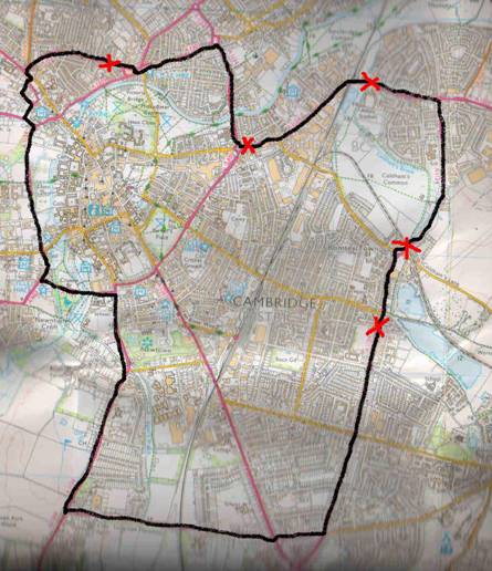 (The course of the Ring Road is marked in black. The locations of the billboard hoardings are marked by red Xs. They are at Perne Road, Victoria Road, Newmarket Road(2) and Barnwell Road.)