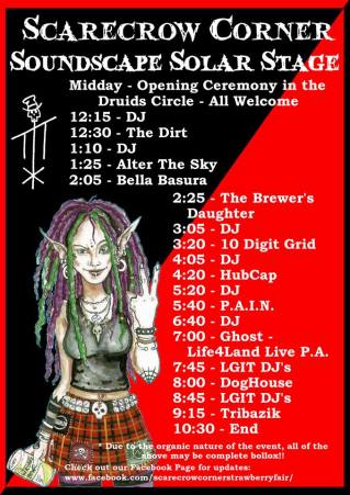 Many years ago Scarecrow Corner used to be called The Green Area, but had to change it’s name in 2012 when the whole fair went green. it’s still over in the far left corner by the river and aside from some hippy trappings – The Peace Labyrinth, Body-Art Mike’s tipi and The Tree Circle – it’s now a writhing mass of Cambridge’s finest Punk offerings. I am on at 2pm, just a short 15 minute set of classic Basura-isms.
